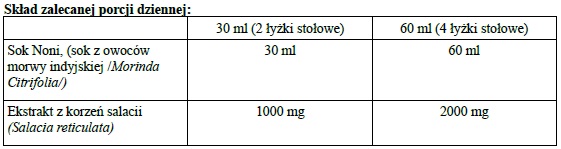 Składniki: Sok z owoców Morwy Indyjskiej (Morinda Citrifolia), ekstrakt z owoców Salacii (Salacia Reticulata).