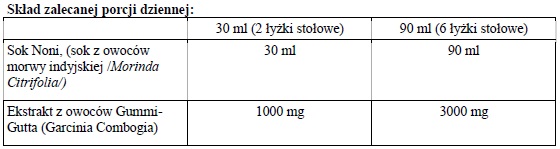 Składniki: Sok z owoców morwy indyjskiej (Morinda Citrifolia), ekstrakt z owoców Gummi-Gutta (Garcinia Cambogia).