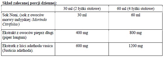 Składniki: Sok z owoców morwy indyjskiej (Morinda Citrifolia), ekstrakt z owoców Pieprz długi (Piper longum), oraz ekstrakt z liści Adhatoda Vasica (Justicia Adhatoda)